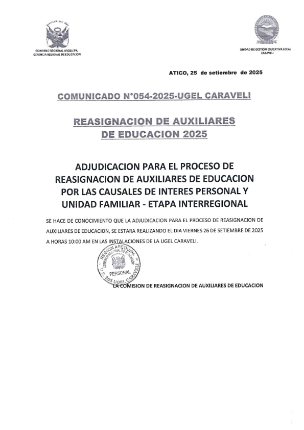 COMUNICADO N° 54 – REASIGNACION DE AUXILIARES DE EDUCACIÓN 2025 – ADJUDICACIÓN ETAPA INTERREGIONAL – UGEL CARAVELI Deja un comentario Comparte