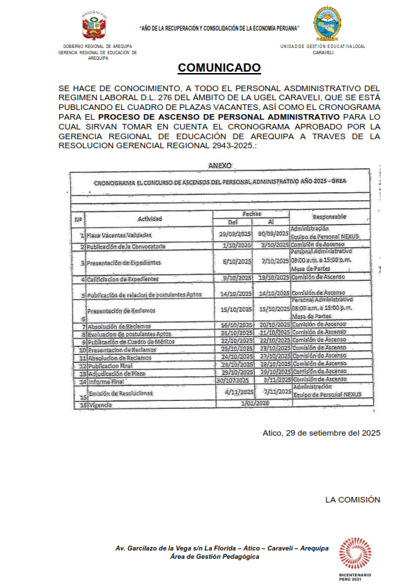 Comunicado – Publicación de plazas administrativas y cronograma para el proceso de ascenso de personal administrativo D.l.276 ámbito Caraveli Deja un comentario Comparte