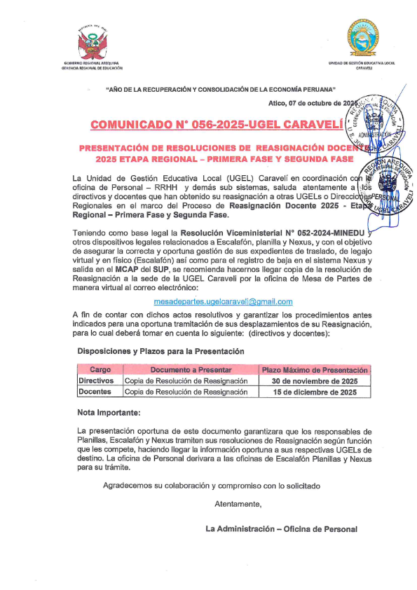 COMUNICADO N° 56 – PRESENTACION DE RESOLUCIONES DE REASIGNACIÓN DOCENTE 2025 – ETAPA REGIONAL PRIMERA Y SEGUNDA FASE Deja un comentario Comparte