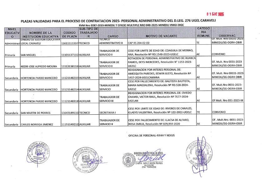 PUBLICACIÓN DE PLAZAS D. LEG 276 – PROCESO DE CONTRATACION – UGEL CARAVELI Deja un comentario Comparte