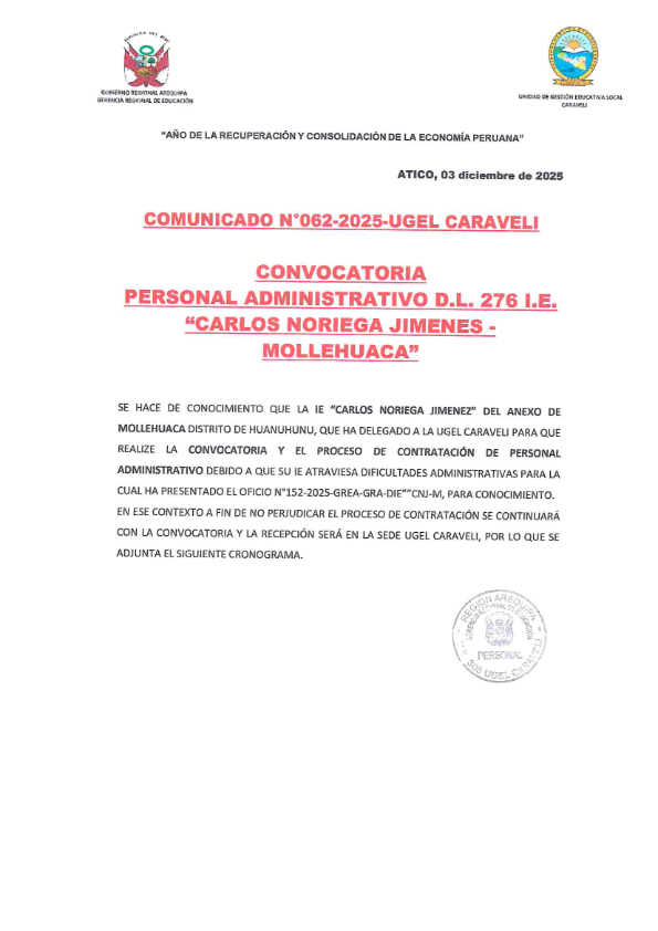 COMUNICADO N° 062- 2025- CONVOCATORIA PERSONAL ADMINISTRATIVO D.L. 276 I.E. «CARLOS NORIEGA JIMENES» – UGEL CARAVELI
