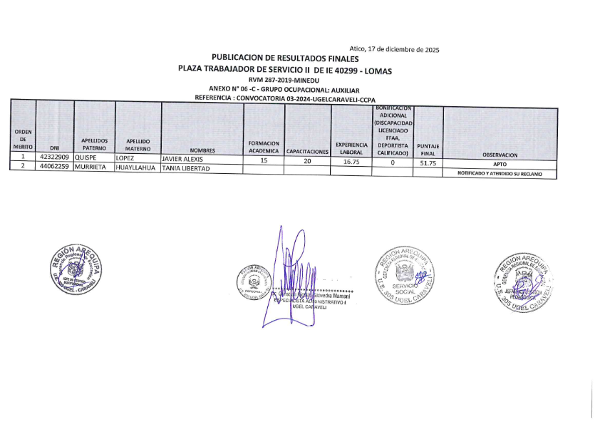 PUBLICACION DE RESULTADOS FINALES – PLAZAS D.L. 276 – UGEL CARAVELI