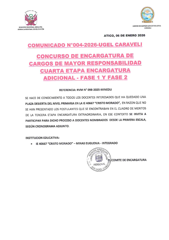 COMUNICADO N° 04- CONCURSO PARA ENCARGATURA ADICIONAL – CUARTA ETAPA