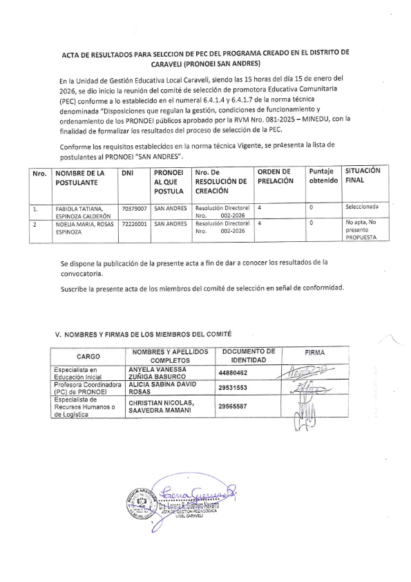 ACTA DE RESULTADOS – PEC – PRONOEI SAN ANDRES – CARAVELI
