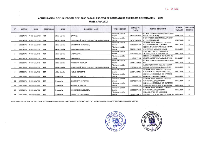 ACTUALIZACION DE PLAZAS PARA EL PROCESO DE CONTRATOS DE AUXILIARES DE EDUCACION 2026 – UGEL CARAVELI Deja un comentario Comparte
