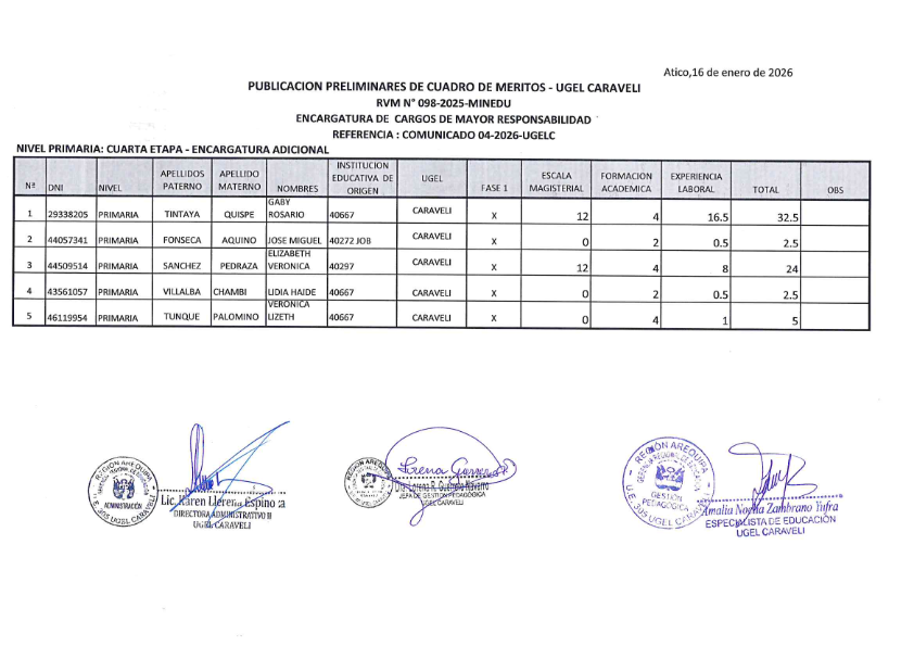 PUBLICACION PRELIMINARES DE CUADRO DE MERITOS – UGEL CARAVELI NIVEL PRIMARIA: IE 40667 -CUARTA ETAPA – ENCARGATURA ADICIONAL Deja un comentario Comparte
