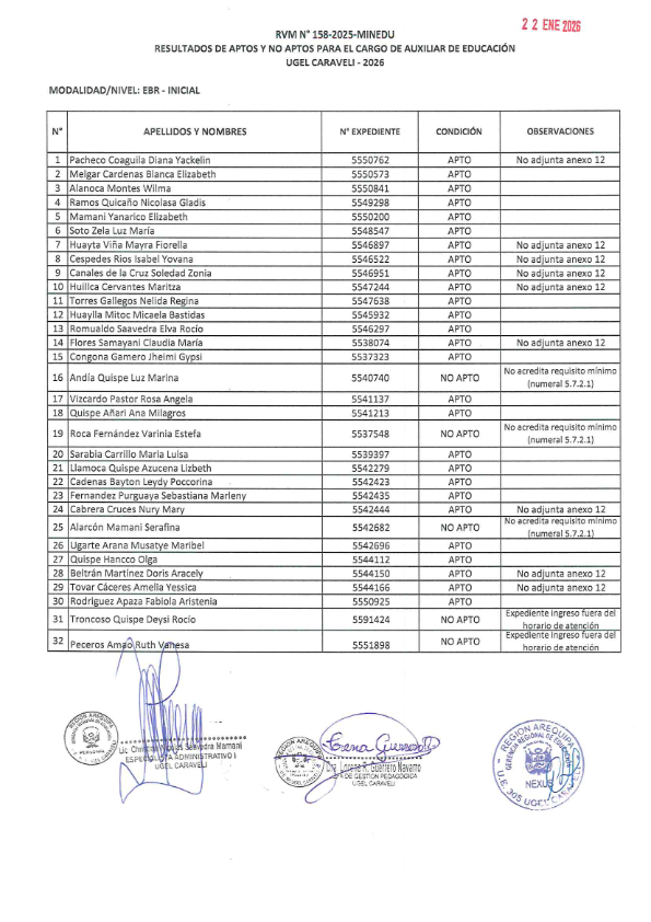 PUBLICACIÓN DE POSTULANTES APTOS Y NO APTOS CONCURSO DE AUXILIARES DE EDUCACIÓN 2026 – UGEL CARAVELI Deja un comentario Nota: Los expedientes observados deben ser subsanados según marco normativo vigente y dentro de los plazos establecidos en el cronograma aprobado. Comparte