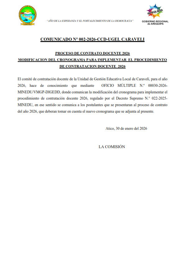 COMUNIADO N° 02 – PROCESO DE CONTRATO DOCENTE 2026MODIFICACION DEL CRONOGRAMA PARA IMPLEMENTAR EL PROCEDIMIENTODE CONTRATACION DOCENTE 2026 Deja un comentario Comparte
