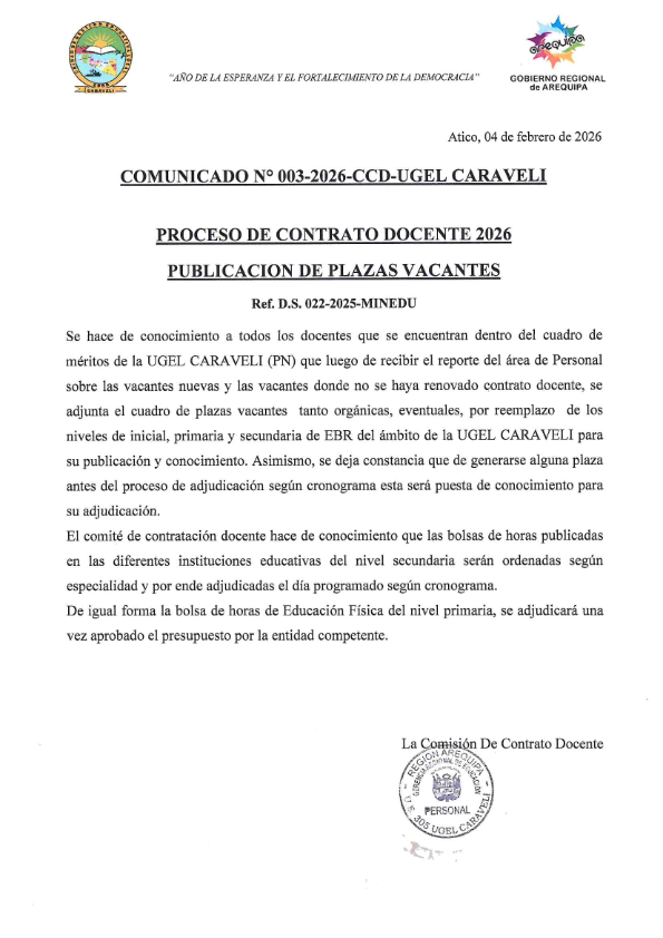 Comunicado N° 003 – Publicacion de Plazas Vacantes Docentes UGEL Caraveli Deja un comentario Comparte