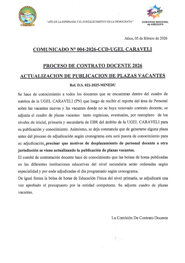Comunicado N° 04- Actualización de plazas vacantes para contratación docente 2026 Deja un comentario Comparte