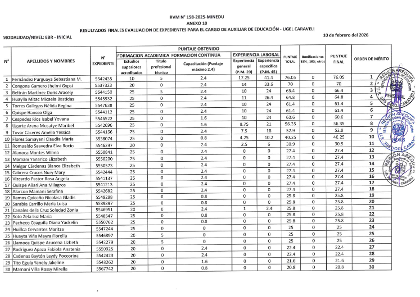 RESULTADOS FINALES EVALUACION DE EXPEDIENTES PARA EL CARGO DE AUXILAIRES DE EDUCACION – UGEL CARAVELI