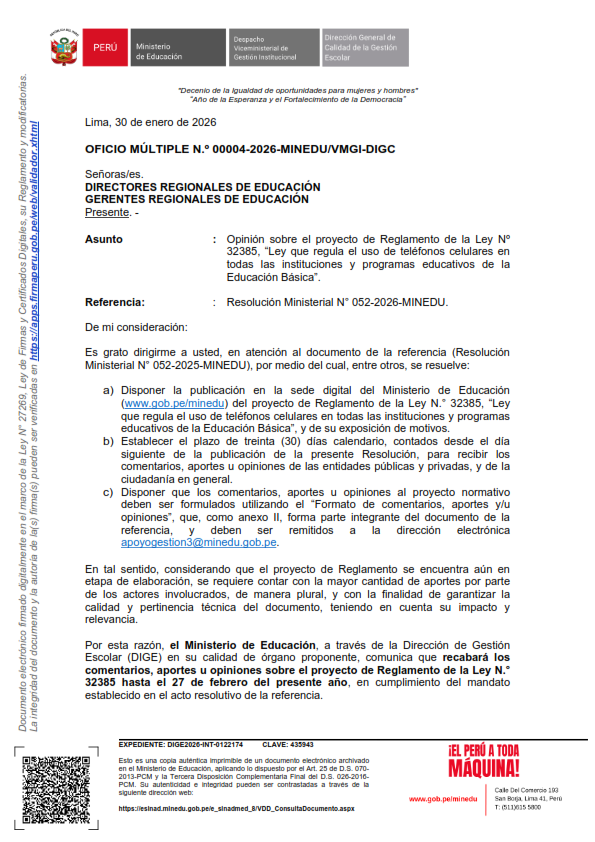 Opinión sobre el proyecto de Reglamento de la Ley Nº32385, “Ley que regula el uso de teléfonos celulares entodas las instituciones y programas educativos de laEducación Básica”. Deja un comentario Comparte