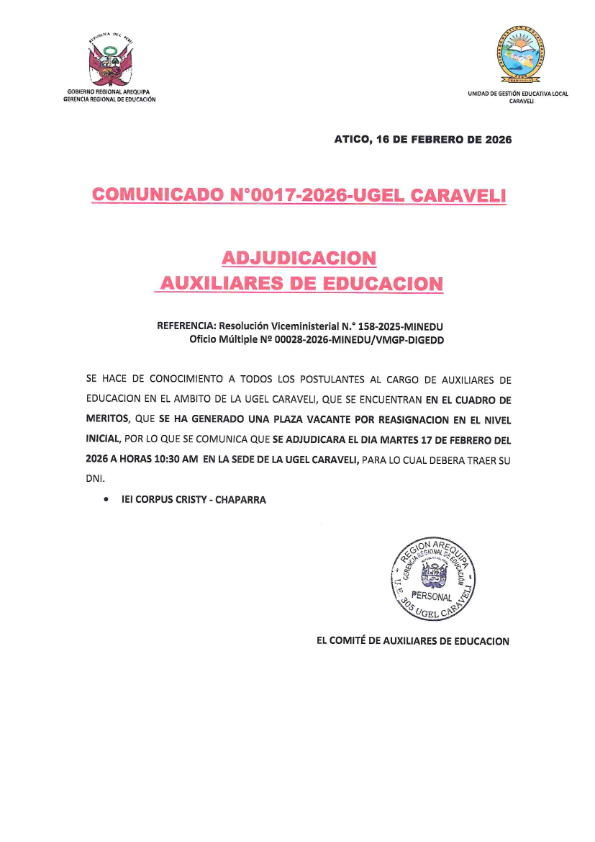 COMUNICADO N° 0017-ADJUDICACION AUXILIAR DE EDUCACION NIVEL INICIAL