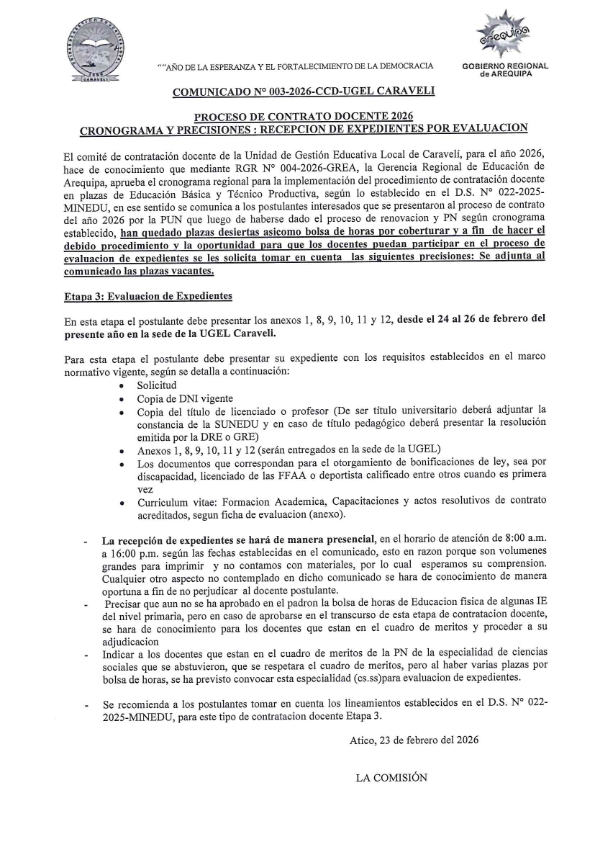 COMUNICADO N° 003-2026-CCD-UGEL CARAVELI – PUBLICACION DE PLAZAS Y RECEPCION DE EXPEDIENTES: 3ERA ETAPA EVALUACION DE EXPEDIENTES Deja un comentario Comparte