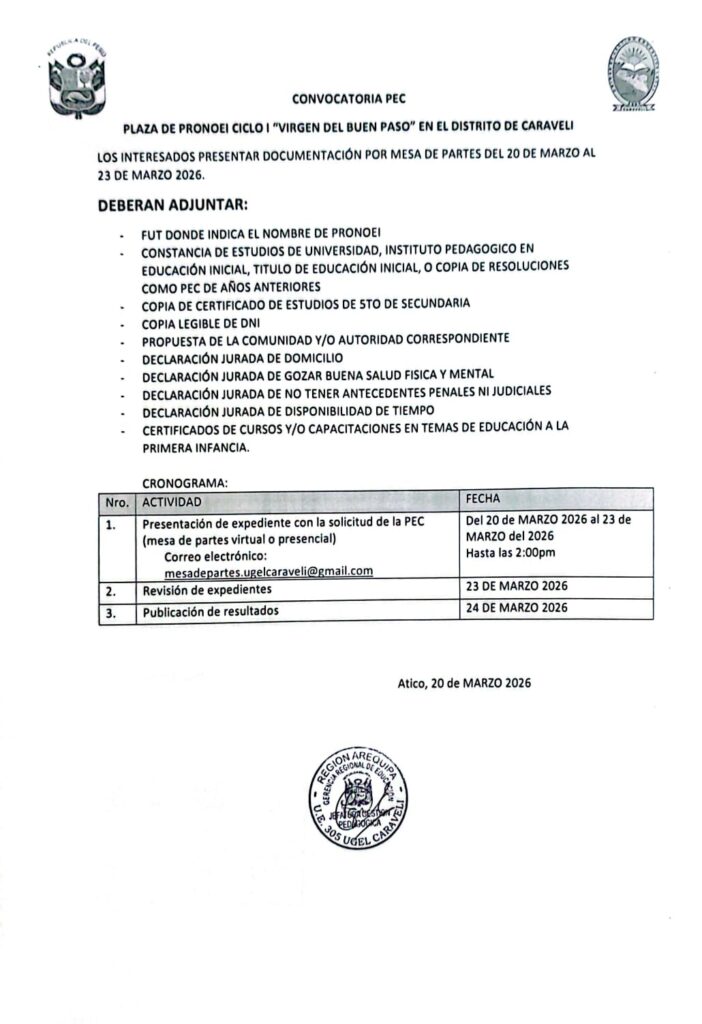 Convocatoria PEC – Virgen del Buen Paso – Caraveli
