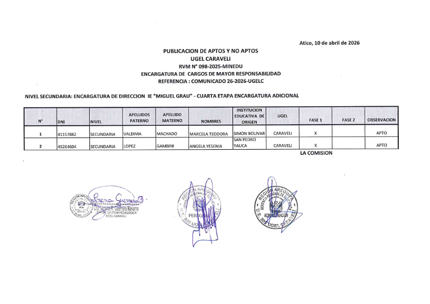 PUBLICACION DE APTOS Y NO APTOS NIVEL SECUNDARIA: ENCARGATURA DE DIRECCION IE «MIGUEL GRAU» – CUARTA ETAPA ENCARGATURA ADICIONAL