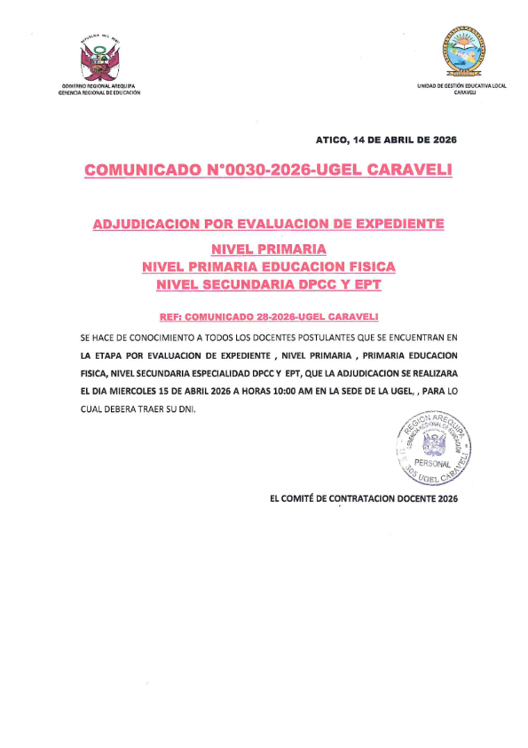 Comunicado N° 030 – ADJUDICACIÓN POR EVALUACIÓN DE EXPEDIENTE – NIVEL PRIMARIA – NIVEL PRIMARIA EDUCACIÓN FÍSICA – NIVEL SECUNDARIA DPCC Y EPT Deja un comentario Comparte