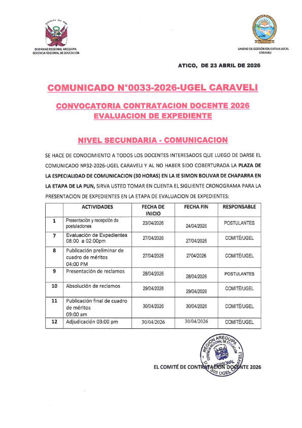 COMUNICADO N°0033-2026-UGEL CARAVELI CONVOCATORIA CONTRATACION DOCENTE 2026EVALUACION DE EXPEDIENTENIVEL SECUNDARIA – COMUNICACION Deja un comentario Comparte