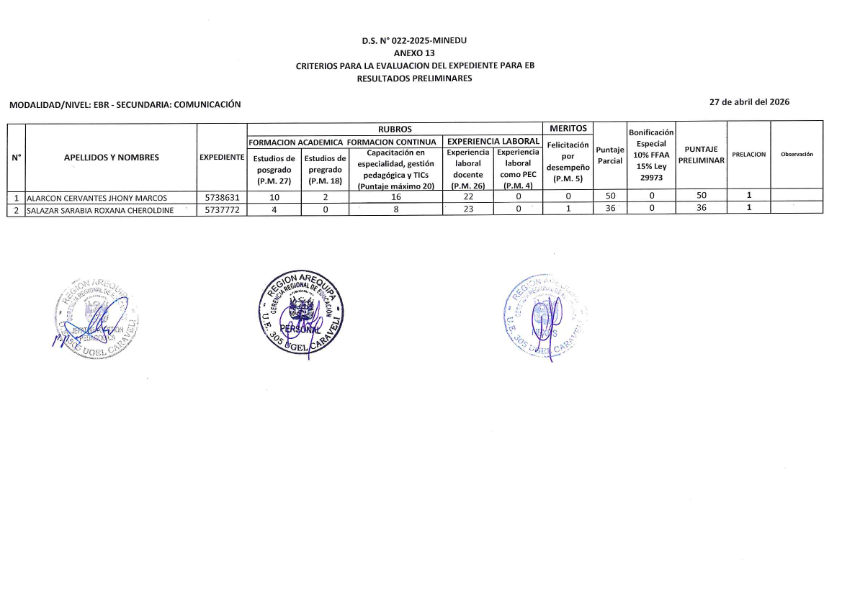 PUBLICACIÓN RESULTADOS PRELIMINARES DE LAEVALUACIÓN DE EXPEDIENTE – NIVEL SECUNDARIA – COMUNICACIÓN Deja un comentario Comparte